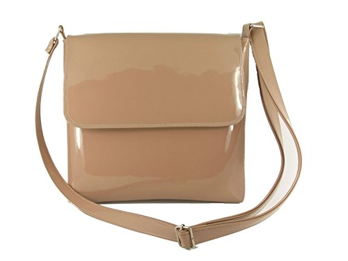 You can read main features below to know more about Loni Womens Cool Faux Patent Leather Cross-Body Shoulder Bag Handbag Medium Size in taupe nude.